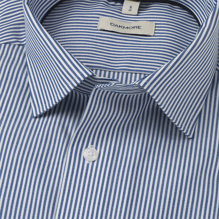 Den har en cutaway-krage og OAKMOREs standardknapper i resirkulert polyester med matchende knappetråd.