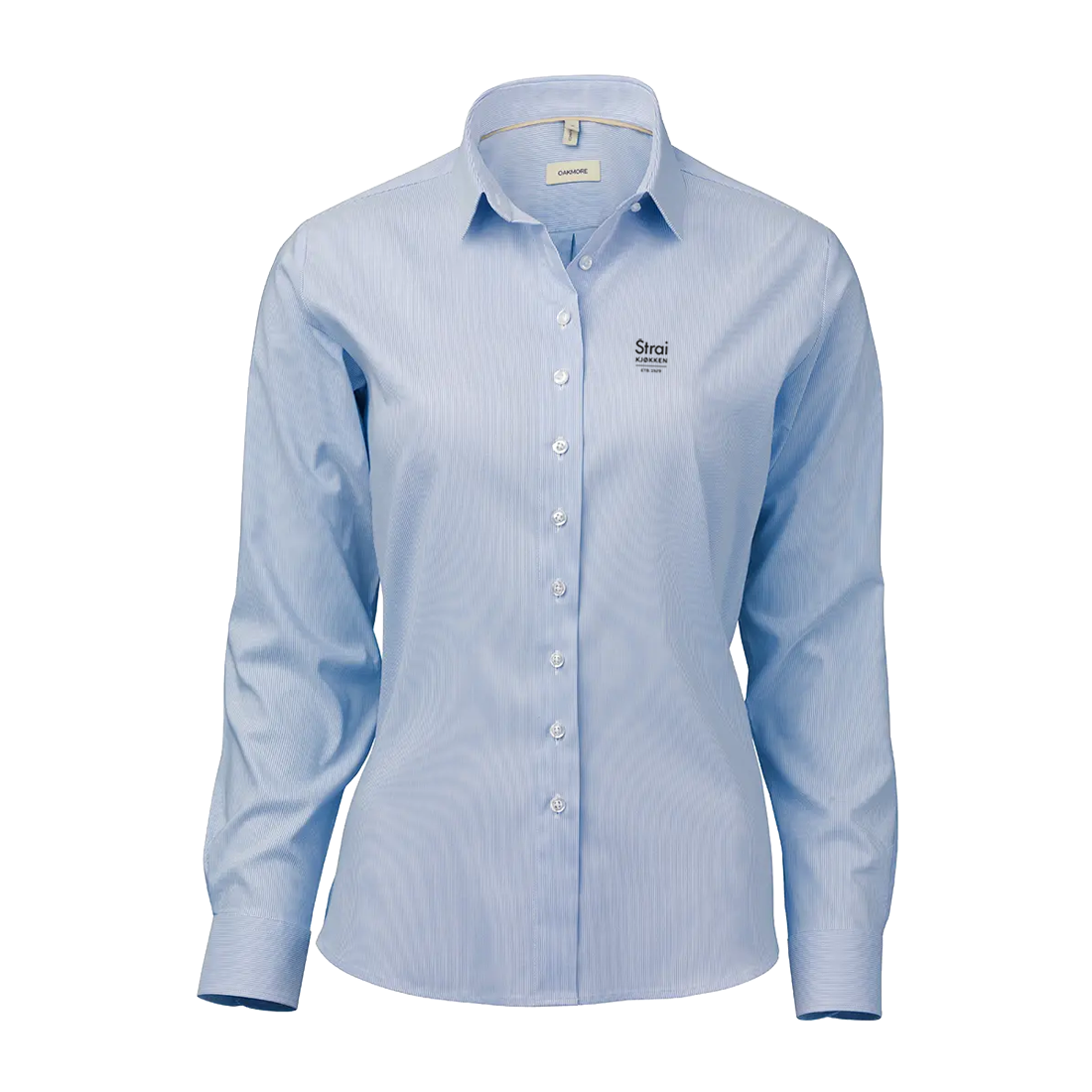 Den har en cutaway-krage og OAKMOREs standardknapper i resirkulert polyester med matchende knappetråd.