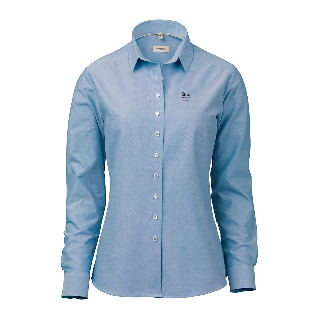 Den har en cutaway-krage og OAKMOREs standardknapper i resirkulert polyester med matchende knappetråd.